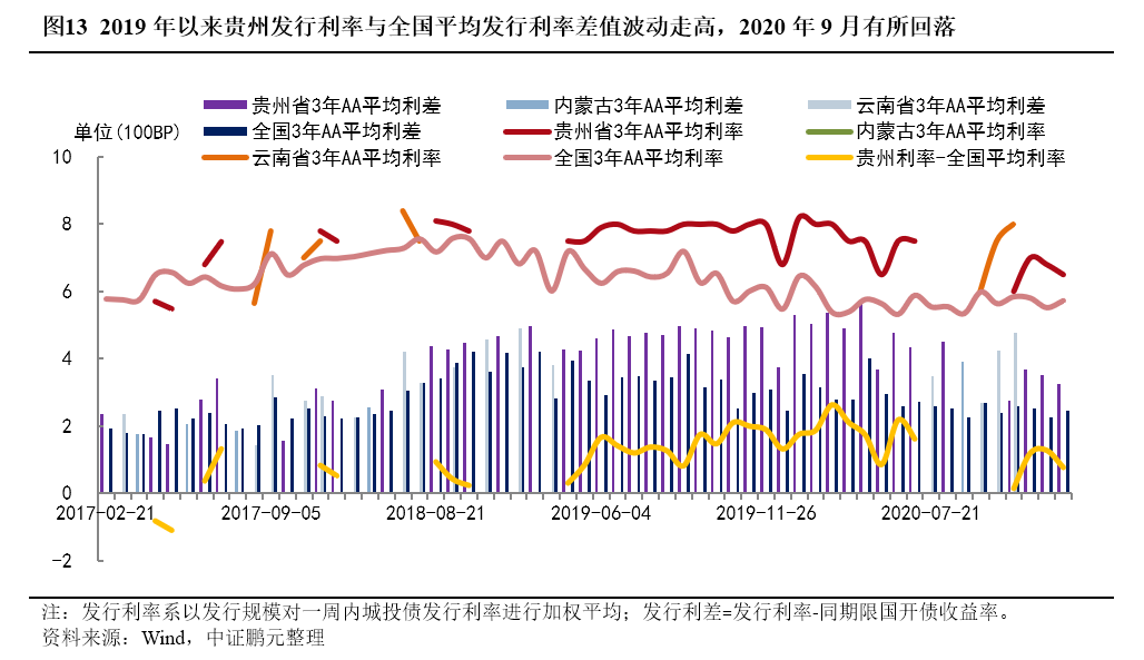 從主要違約地區(qū)城投債發(fā)行利率來看,2019年起貴州省城投債發(fā)行利率與全國平均發(fā)行利率之差波動走高,2020年初最高達(dá)到262BP,2020年9月以來,隨著貴州省利用茅臺化債的力度加大,市場對貴州城投認(rèn)可度有所提升,債券發(fā)行利率有所回落;2018年以來云南地區(qū)城投債發(fā)行利率確有明顯抬升,2017-2019年及2020年1-11月,3年期AA級別城投債平均利差分別為2.53、3.96、4.36和3.79,整體有所增長;內(nèi)蒙古地區(qū)城投債發(fā)行期限、發(fā)行主體級別較分散,發(fā)行利率未有明顯趨勢。