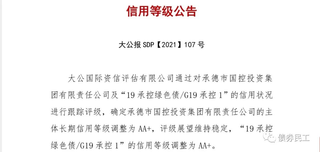 根據大公國際2021年6月28日出具的跟蹤評級報告,承德市國控投資集團有限責任公司的主體信用評級上調至AA+。