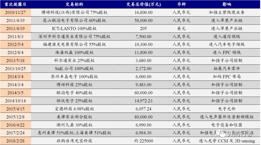 2016年、2017年為了切入聲學領域及蘋果聲學供應鏈,控股蘇州美特、上海及惠州美律;2018年為切入光學領域,收購光寶攝像頭事業(yè)部;