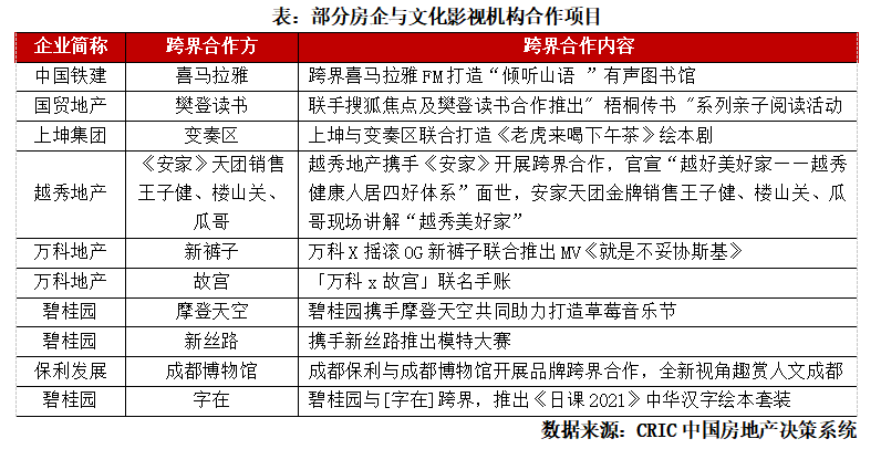而與文化影視的合作同樣是為了豐富企業的文化底蘊,傳達企業精神。例如中國鐵建與喜馬拉雅FM打造“傾聽山語 ”有聲圖書館,國貿地產聯手樊登讀書推出" 梧桐傳書 "系列親子閱讀活動,上坤與變奏區聯合打造《老虎來喝下午茶》繪本劇,萬科x故宮的聯名手賬,碧桂園x字在漢字繪本《日課2021》則有助于房企提升文化形象,豐富品牌內涵,萬科提出全新的品牌口號“筋廠”之后,與新褲子樂隊基于主題合力打造的MV作品《就是不妥協斯基》,則傳遞出企業“一根筋”的精神立意,借助其他品牌對房企形象的更新,有助于企業吸引年輕人,進入其社群體系。