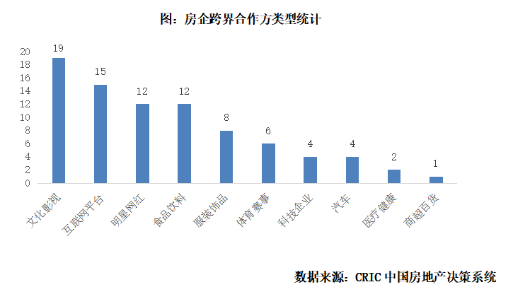 據CRIC不完全統計,2020年百強房企官微共發布39條跨界營銷資訊,2021年這一數量上升至44條,其中與文化影視相關公司跨界營銷最為廣泛,達到了19起,與互聯網平臺的合作數量次之,達到了15起,另外與明星網紅和食品飲料相關合作均為12起。近兩年來,在營銷要“出圈”的理念之下,房企跨界營銷越發頻繁,新嘗試與汽車品牌、動漫IP、奢侈品的跨界合作值得關注。