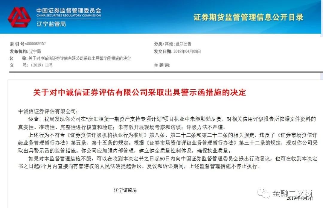 遼寧證監局發現,中誠信證券評估有限公司在“慶匯租賃一期資產支持專項計劃”項目執業中未能勤勉盡責,對相關信用評級報告所依據文件資料的真實性、準確性、完整性進行核查和驗證;未有效開展現場考察和訪談;評級方法不嚴謹。