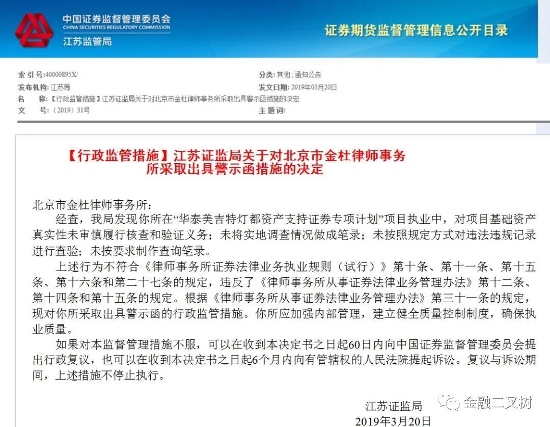 江蘇證監局發現北京市金杜律師事務所在“華泰美吉特燈都資產支持證券專項計劃”項目執業中,對項目基礎資產真實性未審慎履行核查和驗證義務;未將實地調查情況做成筆錄;未按照規定方式對違法違規記錄進行查驗;未按要求制作查詢筆錄。