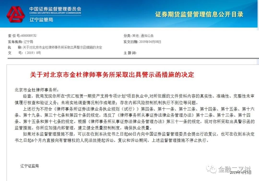 遼寧證監局發現,北京市金杜律師事務所所在“慶匯租賃一期資產支持專項計劃”項目執業中,對所依據的文件資料內容的真實性、準確性、完整性未審慎履行核查和驗證義務;未將實地調查情況制作成筆錄;存在內部風險控制機制執行不到位等問題。