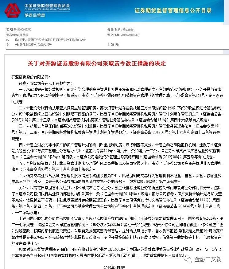 陜西證監局發現,開源證券部分公司債券、資產支持專項計劃盡職調查不充分,信息披露不準確,未勤勉盡責履行存續期管理工作,違反了《公司債券發行與交易管理辦法》(證監會令第113號)第四條、第七條、第四十九條,《證券公司及基金管理公司子公司資產證券化業務管理規定》(證                                      監會公告[2014]49號)第十三條、第四十二條等規定。