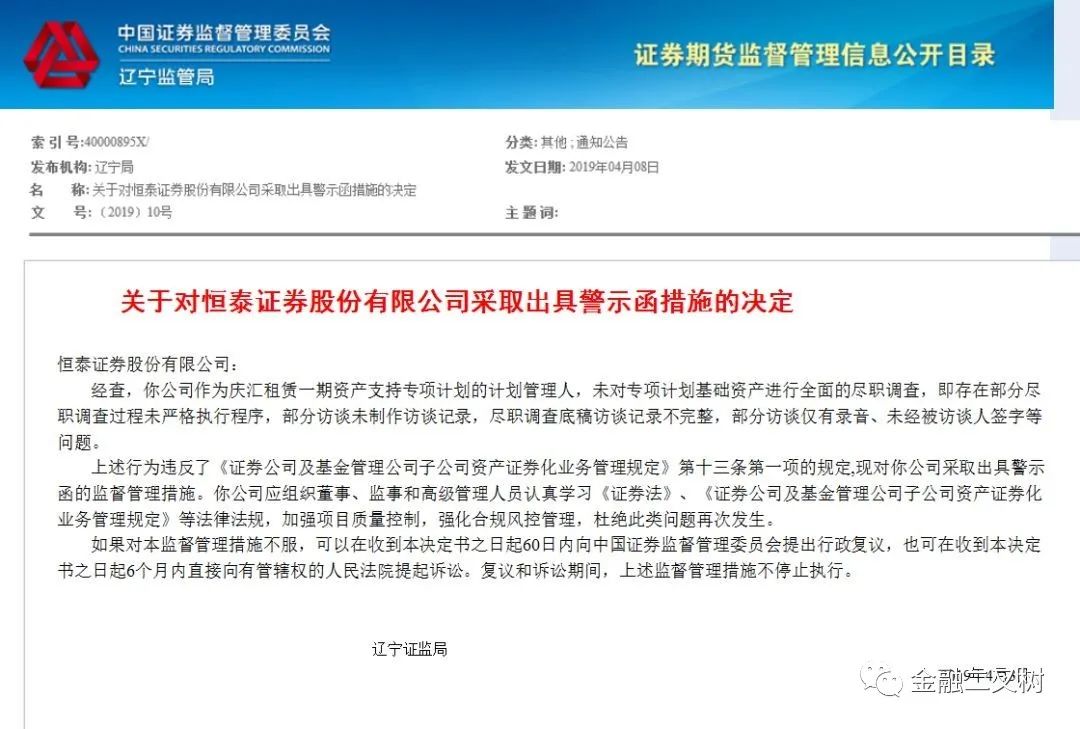 遼寧證監局發現,恒泰證券作為慶匯租賃一期資產支持專項計劃的計劃管理人,未對專項計劃基礎資產進行全面的盡職調查,即存在部分盡職調查過程未嚴格執行程序,部分訪談未制作訪談記錄,盡職調查底稿訪談記錄不完整,部分訪談僅有錄音、未經被訪談人簽字等問題。