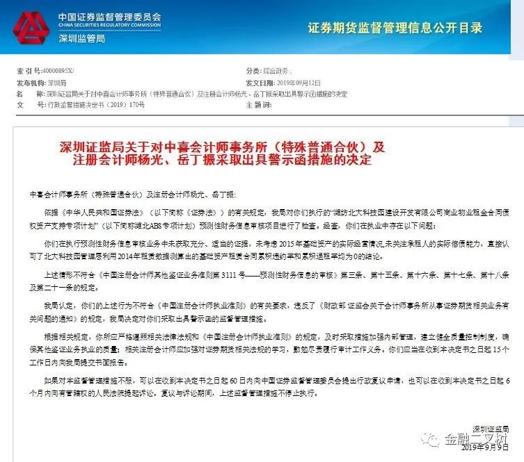證監局對“濰坊北大科技園建設開發有限公司商業物業租金合同債權資產支持專項計劃”(以下簡稱濰北ABS專項計劃)預測性財務信息審核項目進行了檢查。發現中喜會計師事務所及楊光、岳丁振在執業中存在以下問題: