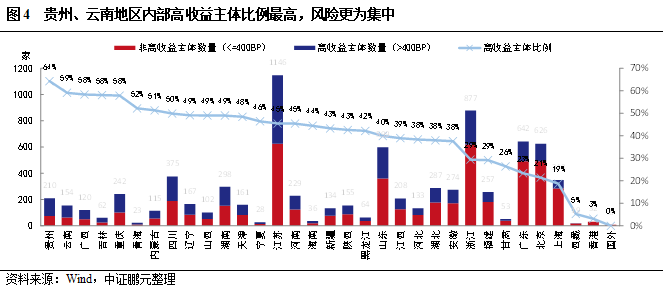 各地高收益主體絕對數量的高低,往往與該地區發債基數的大小相關,而不能反映地區內部風險分化的情況。為進一步觀察地區內部風險分化情況,我們統計了各地高收益主體占該地區全體發行人的比例(圖4)。我們觀察到與絕對數量分布截然不同的排序:貴州、云南兩大網紅高風險地區的高收益主體比例分列第一和第二位,反映該地區內高風險主體比例較高,地區風險更為集中;吉林、重慶、內蒙古、遼寧、湖南、天津等常見高風險地區也位居前列,而絕對數量較多的江蘇、山東則位居中游,浙江更是居后,反映其地區內高風險主體比例較低,地區風險較為分散。