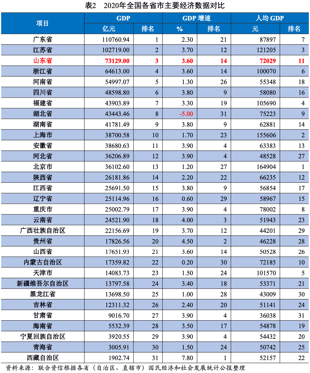 從經(jīng)濟(jì)運(yùn)行方面看,2018-2020年,山東省經(jīng)濟(jì)實力不斷增強(qiáng),2020年GDP總量處于全國前列,保持全國第3位,經(jīng)濟(jì)增速受疫情影響有所回落,仍高于全國GDP增速1.30個百分點。2018-2020年,山東省人均GDP逐年提高,與全國GDP水平基本持平,位居全國第11位。