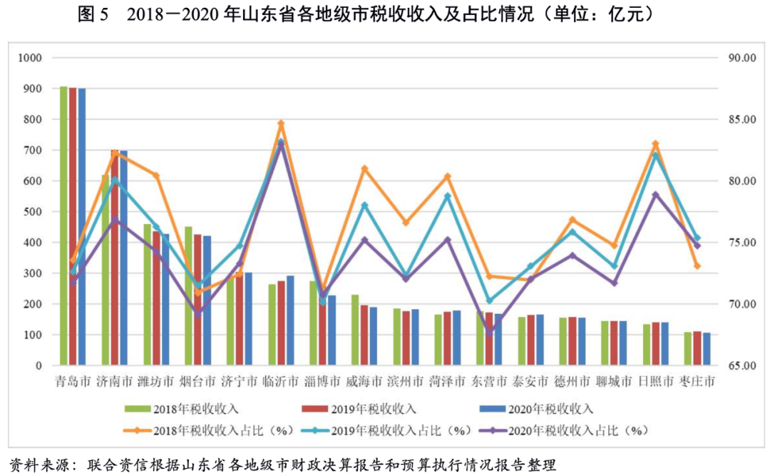 從一般公共預(yù)算收入來看,2018-2020年山東省大部分地級市的一般公共預(yù)算收入呈增長趨勢。2020年,青島市一般預(yù)算收入在山東省內(nèi)遙遙領(lǐng)先,為1253.85億元;同期,濟(jì)南市、煙臺市和濰坊市一般公共預(yù)算收入均超過了500億元,分別為906.08億元、610.07億元和573.90億元。除日照市和棗莊市外,其余地級市一般公共預(yù)算收入均超過了200億元。一般公共預(yù)算收入增速方面,2018-2020年,受經(jīng)濟(jì)增速放緩、減稅降費(fèi)政策及新冠肺炎疫情等因素綜合影響,山東省各地級市一般公共預(yù)算收入增速均有不同程度下滑;2019年,威海市、淄博市和煙臺市為負(fù)增長,主要系減稅降費(fèi)導(dǎo)致的稅收收入下降所致;2020年,威海市和煙臺市一般公共預(yù)算收入增速由負(fù)轉(zhuǎn)正,淄博市和棗莊市一般公共預(yù)算收入增速為負(fù),其中淄博市一般公共預(yù)算收入下降幅度較2019年進(jìn)一步擴(kuò)大。