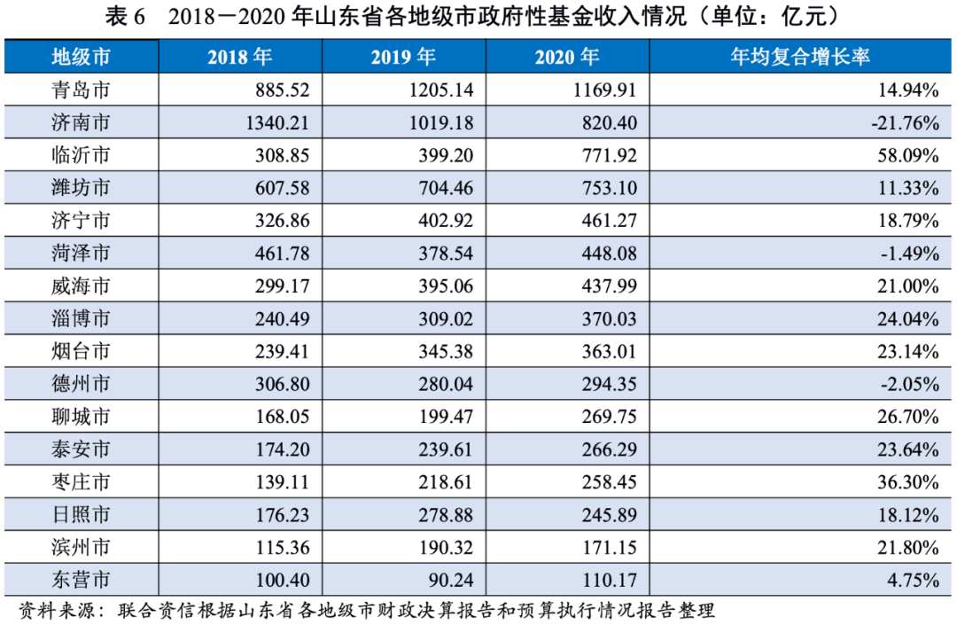 從政府性基金收入來看,山東省各地級市土地出讓情況差異明顯,2018-2020年各地級市政府性基金收入年均復(fù)合增長率差異亦較大。2020年,青島市、濟(jì)南市、臨沂市和濰坊市的政府性基金收入規(guī)模處于第一梯隊,均超過750億元,遠(yuǎn)超其他地級市。其中,臨沂市政府性基金收入較2018年和2019年大幅增長,突破750億元。山東省其他地級市政府性基金收入規(guī)模均在500億元以下,東營市規(guī)模最小,2020年僅為110.17億元。從政府性基金收入占綜合財力的比重來看,2020年威海市和臨沂市政府性基金收入占綜合財力的比重均超過50%,成為該地級市綜合財力的主要來源。