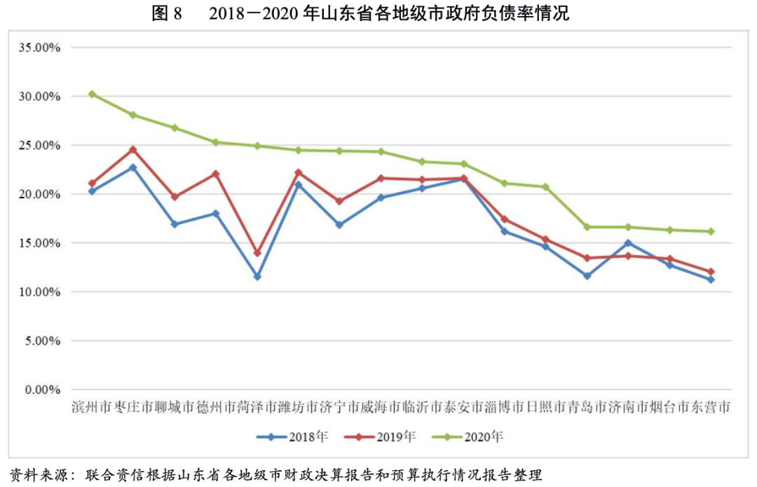 債務(wù)負(fù)擔(dān)方面,2018-2020年,山東省各地級市政府負(fù)債率均呈增長態(tài)勢。2020年,濱州市政府負(fù)債率為省內(nèi)各地級市中最高(30.21%),較上年末增長9.15個百分點,菏澤市政府負(fù)債率增幅最大,為11.01個百分點。2020年,青島市、濟(jì)南市、煙臺市和東營市政府負(fù)債率低于20%。