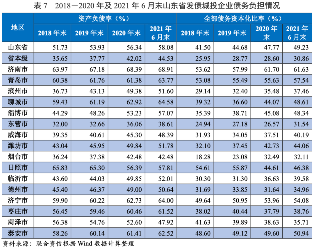 從發(fā)債城投企業(yè)債務(wù)負(fù)擔(dān)看,2018-2020年末,山東省發(fā)債城投企業(yè)整體資產(chǎn)負(fù)債率和全部債務(wù)資本化比率呈上升趨勢,山東省發(fā)債城投企業(yè)的債務(wù)負(fù)擔(dān)有所加重。從山東省各地級市城投企業(yè)債務(wù)指標(biāo)看,截至2021年6月末,濟(jì)南市、青島市、濟(jì)寧市和泰安市的城投企業(yè)資產(chǎn)負(fù)債率均超過60%、全部債務(wù)資本化比率均超過50%,上述地級市的城投企業(yè)債務(wù)負(fù)擔(dān)較重。