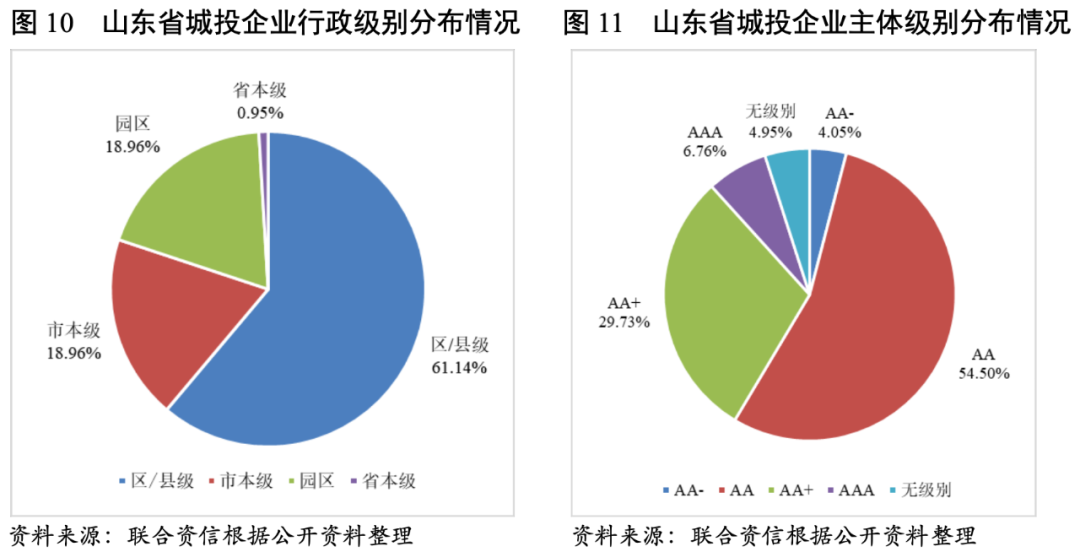 截至2021年10月28日,山東省有存續(xù)主體級別的城投企業(yè)共211家。其中,省本級城投企業(yè)2家,地級市本級城投企業(yè)40家,地級市下轄區(qū)級及縣級(含縣級市)城投企業(yè)129家,園區(qū)城投企業(yè)40家;主體級別為AAA的城投企業(yè)15家,主體級別為AA+的城投企業(yè)66家,主體級別為AA的城投企業(yè)121家,主體級別為AA-的城投企業(yè)9家。分地級市來看,濰坊市的城投企業(yè)數(shù)量最多,為42家,其次為青島市(41家)、威海市(16家)、臨沂市(15家)、濟(jì)南市(15家)、濟(jì)寧市(15家)和淄博市(11家),其余地級市城投企業(yè)數(shù)量相對較少。從級別分布看,AAA城投企業(yè)主要集中于省本級及經(jīng)濟(jì)財政實力強(qiáng)的青島市和濟(jì)南市,其余地級市中只有煙臺市、臨沂市和濰坊市各有1家AAA城投企業(yè),但上述地級市與青島市和濟(jì)南市的經(jīng)濟(jì)和財政實力存在一定的差距。除聊城市和日照市以外,其余地級市均有AA+級別城投企業(yè),聊城市和日照市城投企業(yè)最高級別為AA,級別為AA-的城投企業(yè)全部位于區(qū)縣和園區(qū)。