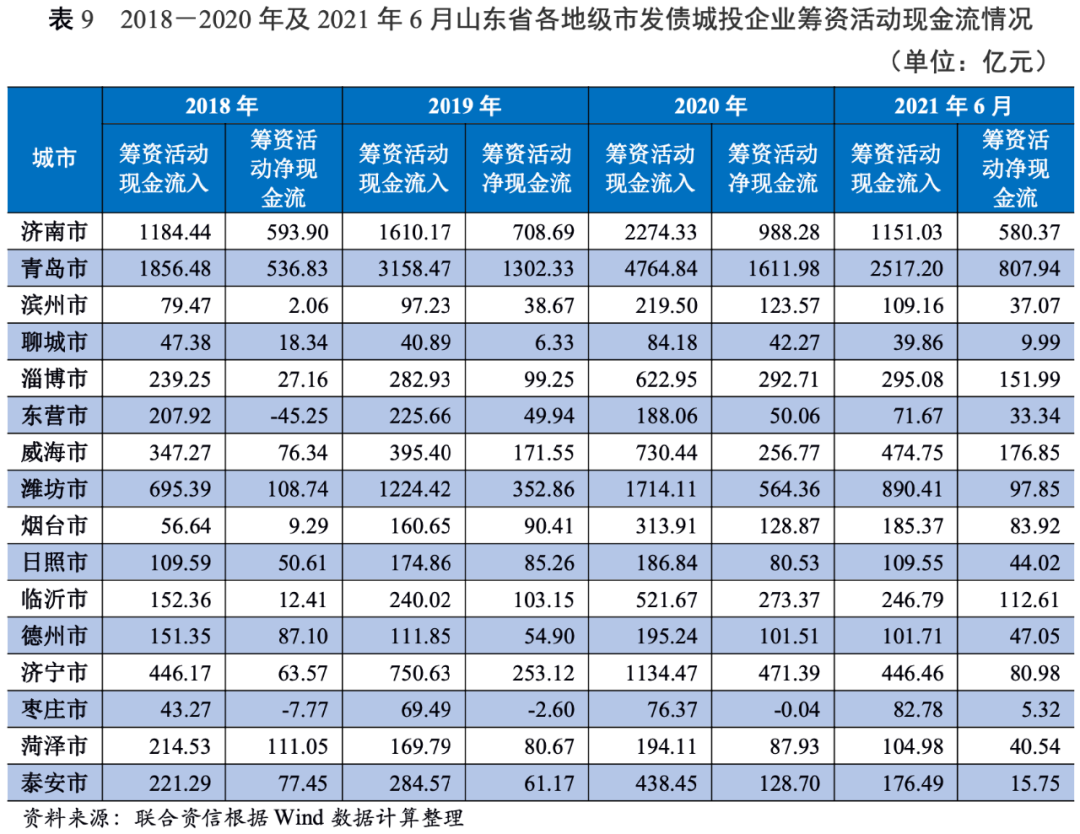 從山東省各地級市發(fā)債城投企業(yè)籌資活動凈現(xiàn)金流狀況來看,2018-2020年山東省大部分地級市籌資活動凈現(xiàn)金流均有所擴(kuò)大,其中濟(jì)南市和青島市發(fā)債城投企業(yè)的融資能力在山東省內(nèi)領(lǐng)先。2020年,除棗莊市以外,其余各地級市發(fā)債城投企業(yè)籌資活動凈現(xiàn)金流均呈凈流入狀態(tài);2021年上半年,棗莊市發(fā)債城投企業(yè)籌資活動凈現(xiàn)金流轉(zhuǎn)正。總體看,山東省各地級市城投企業(yè)融資狀況有一定差異。