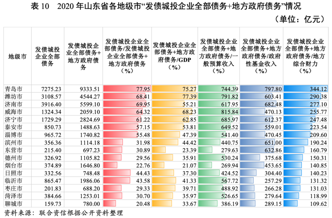 從發(fā)債城投企業(yè)全部債務(wù)與“發(fā)債城投企業(yè)全部債務(wù)+地方政府債務(wù)”的比值看,截至2020年末,青島市的比值最高,為77.95%,濟(jì)南市、威海市、濰坊市和濟(jì)寧市的比值超過60%,其余地級市的比值處于20%~60%之間。