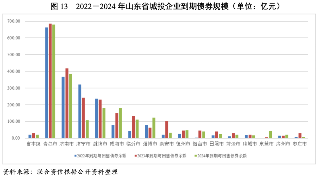 從山東省各地級市發(fā)債城投企業(yè)未來三年(2022-2024年)到期債券規(guī)模看,青島市和濟(jì)南市的城投企業(yè)未來三年集中到期債券規(guī)模大,棗莊市、濱州市和東營市城投企業(yè)到期債券規(guī)模相對較小。從山東省各地級市發(fā)債城投企業(yè)未來三年到期債券規(guī)模占已發(fā)行債券規(guī)模的比重看,大部分地級市占比在70%~90%之間,泰安市未來三年到期債券規(guī)模占比最大(占91.12%),濱州市占比最小(占61.99%)。