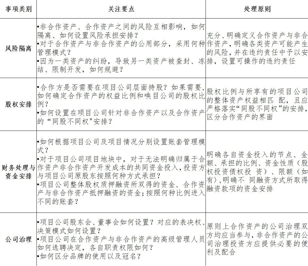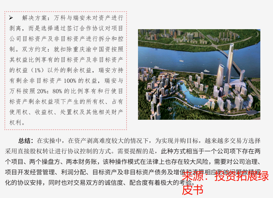 2)非目標資產的所有者權益部分不僅僅要在拆分時點大于0,更要考慮在標的資產完成開發(fā),收購方退出時,非標的資產權益部分仍然要大于0,否則就會出現標的資產部分替非標的資產背債的情況,如果合作方有其他足值資產替非標的資產權益做擔保,也可接受。