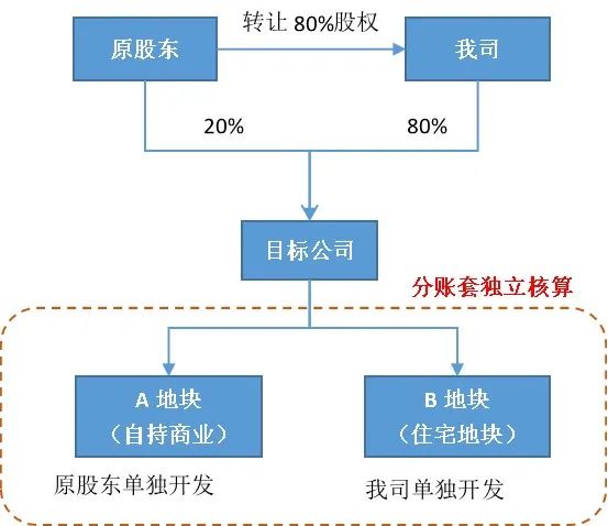 本次我們只講投拓實操中最常見到模式③,即是我方通過收購對方部分股權,但雙方約定該部分股權對應目標地塊100%的開發(fā)收益權,開發(fā)過程中,采用分帳套的方式獨立核算、分別管理。而非目標地塊則仍由項目公司原股東繼續(xù)開發(fā)。