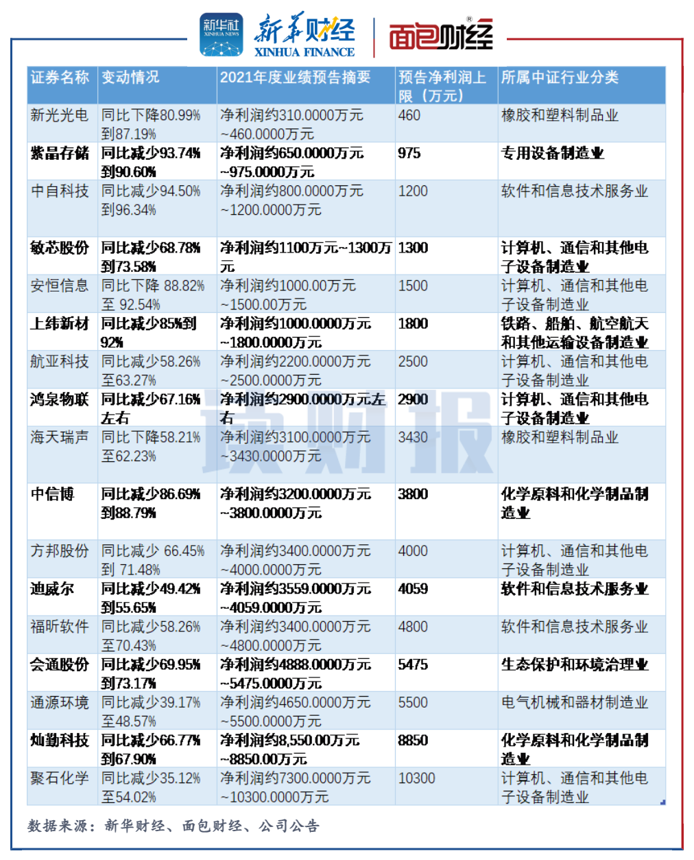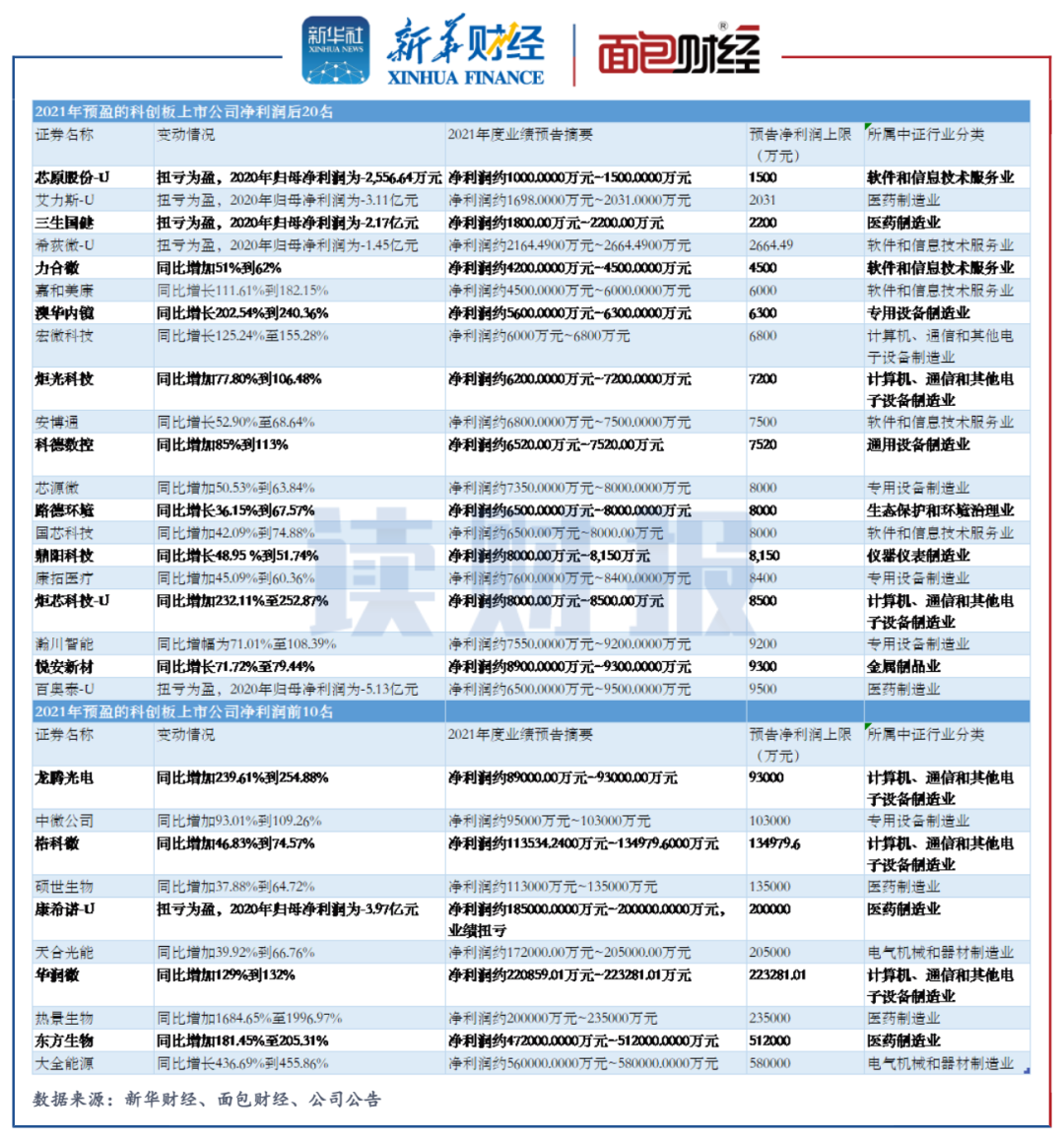 根據各家公司2021年的業績預告,合計134家上市公司預告歸母凈利潤為正,其中117家公司預告較上年同期增加。按凈利潤的上限做統計,在預盈金額最低的20家公司中,芯原股份-U、艾力斯-U、三生國健、希荻微-U和百奧泰-U實現扭虧為盈。