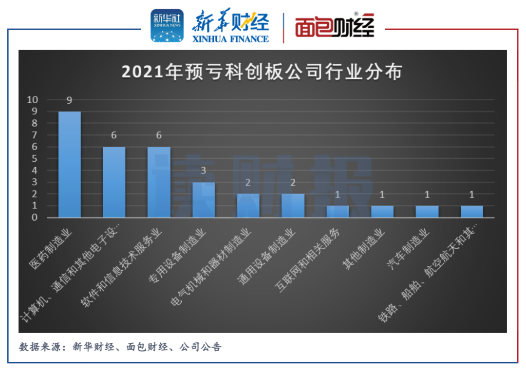 按中證行業分類,2021年預告虧損的32家科創板上市公司中,9家屬于醫藥制造業,計算機、通信和其他電子設備制造業、軟件和信息技術服務業各有6家公司預虧。