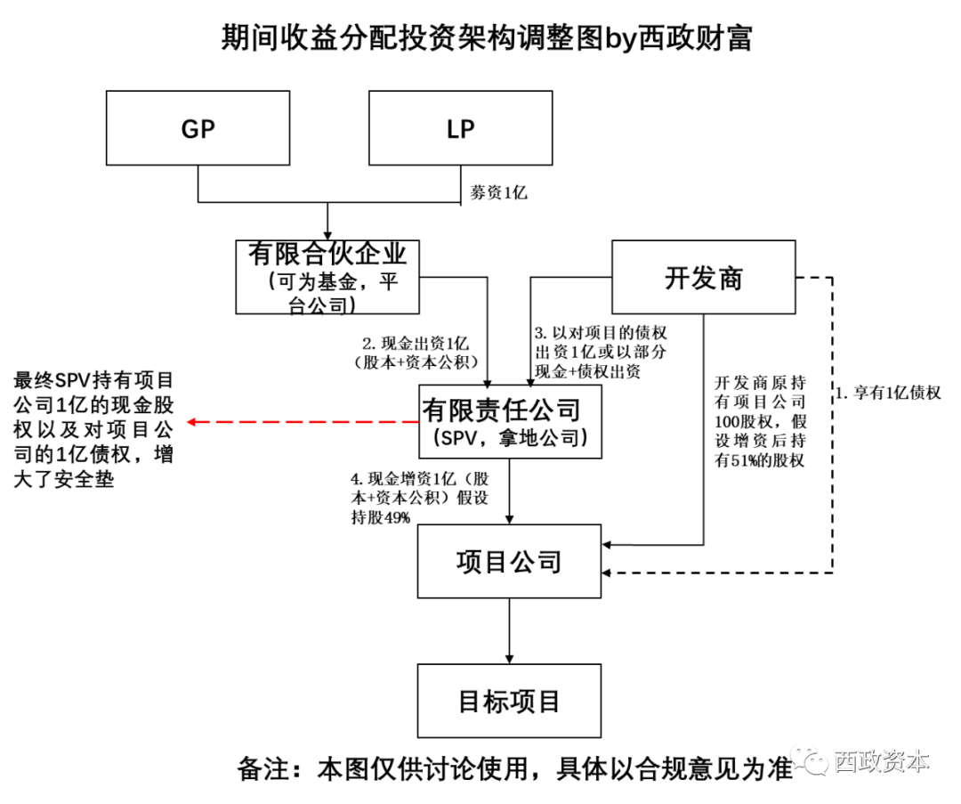 (2)信托計劃投資有限合伙LP份額(亦可投資有限合伙基金LP份額),并由有限合伙通過現金方式(即1億)對有限責任公司SPV進行增資,部分進入實收資本,大部分進入資本公積。開發商則以對項目公司的債權(或債權+部分現金)對SPV進行出資。