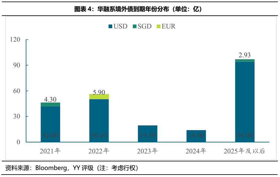 境內債來看,華融系存續境內債也集中在2021-2022年到期,2021年到期規模龐大,主因華融湘江銀行有660.80億的同業存單于2021年到期。在不考慮同業存單的情況下, 華融系2021-2023年分別有340.55億、561.84億和269.18億存續債到期,債務壓力很重。