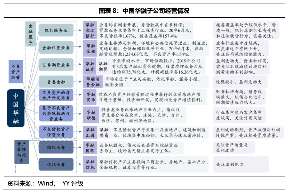 中國華融聚焦不良資產的收購、管理與處置,業務主要分為不良資產經營、金融服務和資產管理與投資三大板塊。其中不良資產經營業務包括不良債權資產經營、政策性債轉股業務、市場化債轉股業務以及子公司開展的不良債權資產經營業務、基于不良資產的特殊機遇投資業務、基于不良資產的房地產開發業務;公司金融服務和資產管理與投資業務則主要由子公司負責經營。
