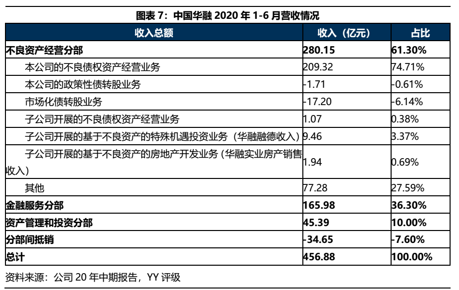 公司營收主要來自不良資產經營業務和金融服務業務,20年1-6月分別實現營收280.15億元和165.98億元,營收占比61.30%和36.30%。不良資產經營業務中本公司的不良債權資產經營業務是主要營收來源,子公司不良資產業務營收貢獻較少。