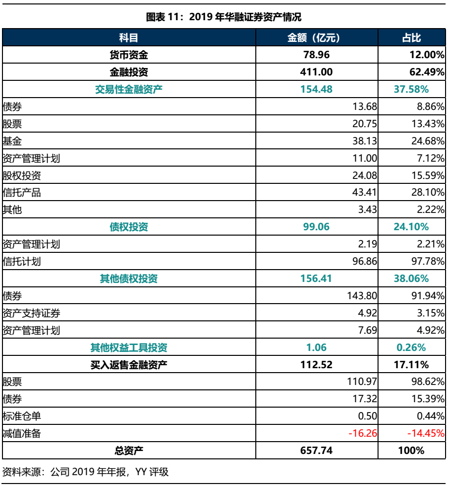 華融證券2019年資產合計657.74億元,以貨幣資金,金融投資和買入返售金融資產為主,從細分科目來看,公司資產主要投向債券、股票和信托等資產。