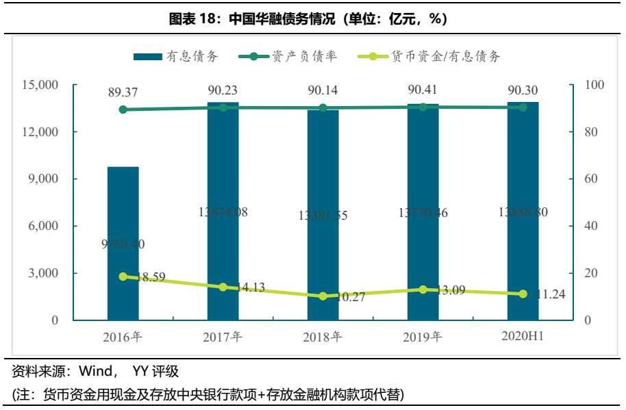 從負債率來看,華融系各公司負債率均超過了75%,華融實業財務杠桿更是高達95.67%,整體融資空間有限。從有息債務來看,中國華融有息債務規模高達13,888.80億元,占總資產的80.21%,貨幣資金/有息債務為11.24%,覆蓋程度較低。