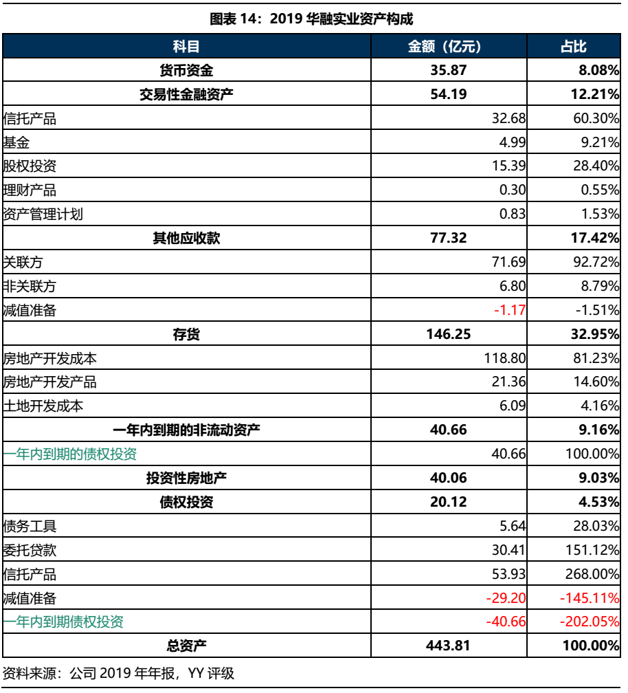 華融實業2019年資產合計443.81億元,主要為存貨、其他應收款、交易性金融資產、一年內到期的非流動資產、貨幣資金、投資性房地產和債權投資,由于不再并表華融國際,資產規模相較于2018年的2,569.68億元大幅下降。