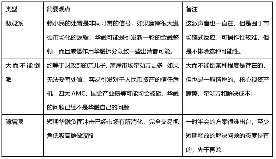 現在到了算大賬,清點代價的時候,華融到底是整體資產包打包處置,還是拆著賣,債到底隨資產走,還是先把網狀的債務割開成為一個個線性的各個擊破、甚至還有投資者在默默祈禱能不能先把資本市場的兌付了剩下該干啥干啥。