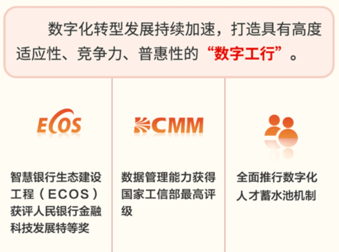 在數(shù)字新基建方面,2021年,工行獲評金融行業(yè)首家數(shù)據(jù)管理能力成熟度五級最高評級;深入貫徹“兩山”發(fā)展理念,打造世界一流的綠色數(shù)據(jù)中心,日交易峰值達(dá)8.68億筆,每年減少二氧化碳排放近6,000噸,獲評“國家綠色數(shù)據(jù)中心”。