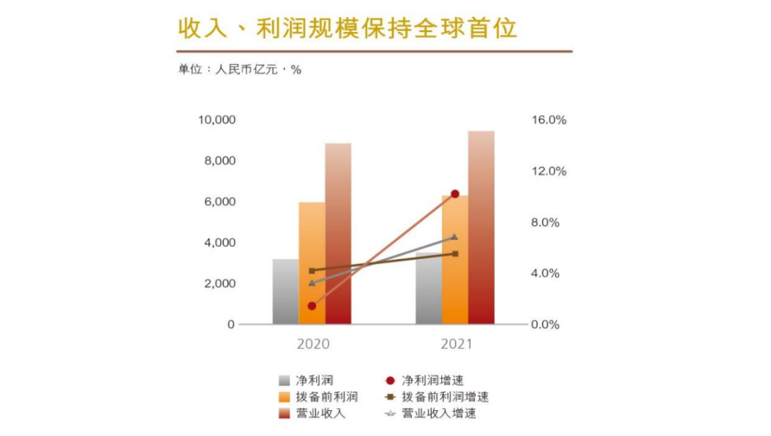 根據(jù)工行2021年報(bào),不管資產(chǎn)、資本、存款、貸款,該行繼續(xù)保持全球第一,凈利潤繼續(xù)保持全球銀行業(yè)第一地位。從國際排名來看,工行已經(jīng)連續(xù)9年位列英國《銀行家》全球銀行1000強(qiáng)和美國《福布斯》全球企業(yè)2000強(qiáng)榜首、位列美國《財(cái)富》500強(qiáng)榜單全球商業(yè)銀行首位,連續(xù)6年蟬聯(lián)全球最具價(jià)值銀行品牌榜首。