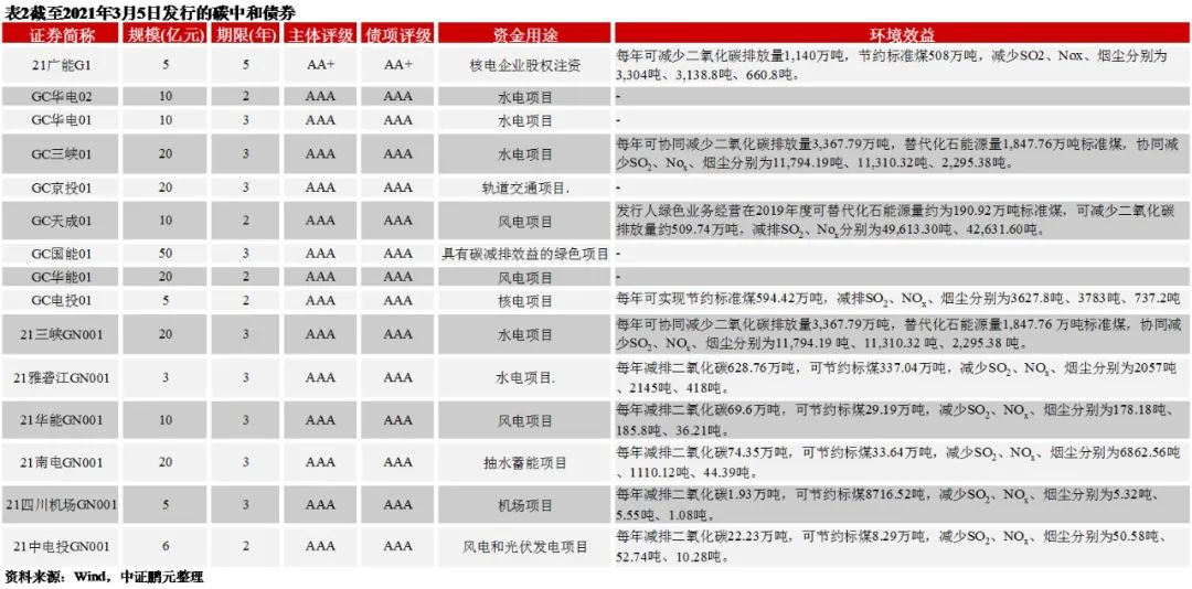 此外,綜合來看,目前碳中和公司債券、碳中和債務融資工具發(fā)行主體信用資質為AA+、AAA級等高級別,屬于央企、地方國企;碳中和債券均是公開發(fā)行;債券期限方面,以2年期、3年期短期限品種為主;募投項目以水電、風電、光伏發(fā)電、核電、抽水蓄能項目等清潔能源為主,也有軌道交通、低碳綠色建筑項目。從募投項目的環(huán)境效益來看,雖然均有碳減排環(huán)境效益,但是各項目減排的碳量有顯著差異,以募投項目每年減排的二氧化碳量來看,分布在1.93萬噸~3,367.79萬噸。