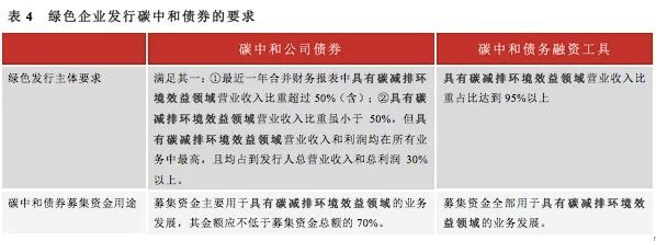 在我們此前的報告《綠色債券的2020,綠色企業(yè)主體如何認證?》中介紹了綠色產業(yè)領域企業(yè)發(fā)行綠色債券的情況。已發(fā)行的碳中和公司債中,華能天成融資租賃有限公司發(fā)行的“GC天成01”就是經認證為綠色企業(yè)的主體發(fā)行的。結合綠色企業(yè)主體的認定標準,我們認為,綠色企業(yè)主體如果要發(fā)行碳中和債券,需要滿足的要求見下表。