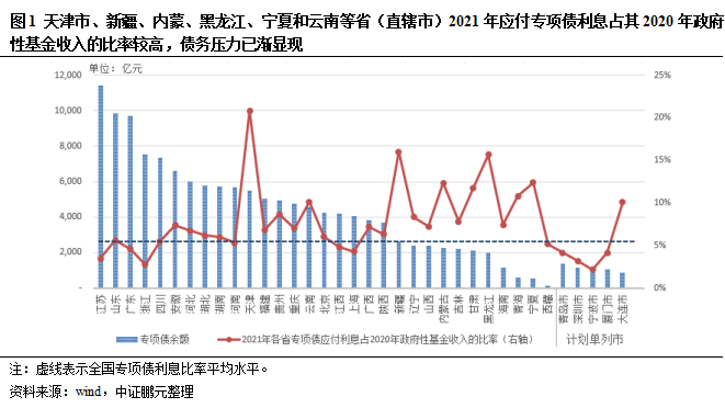截至2021年8月10日,我國地方專項債余額約14.50萬億,占地方政府債券余額總量的52.19%,專項債余額排名靠前的省份包括江蘇省、山東省、廣東省、浙江省和四川省。根據各省專項債存續規模及發行利率來測算2021年專項債應付利息規模,其占各省2020年政府性基金收入的比率(下文統稱“專項債利息比率”)來看,天津市的專項債利息比率超過20%,斷層高于其他省份(直轄市),2020年天津市土地出讓收入大幅下滑,使得政府性基金收入同比下降36.3%,但即使按三年平均政府性基金收入來計算,天津市專項債利息比率仍超過16%,仍處于較高水平;第二梯隊包括新疆、黑龍江、寧夏、內蒙、甘肅、青海、云南和計劃單列市中的大連市,專項債利息比率介于10%-20%之間。