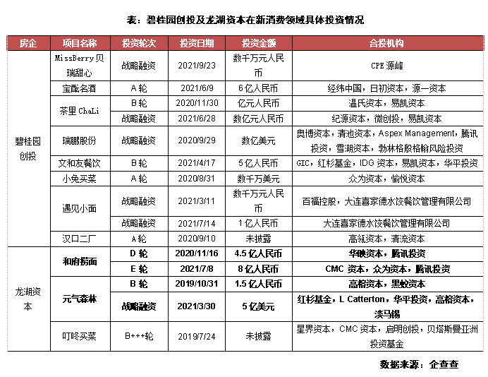 在眾多房企背景的投資機構中,碧桂園創(chuàng)投及龍湖資本在新消費領域布局較為深入。其中碧桂園創(chuàng)投成立于2019年1月,為碧桂園集團的直屬股權投資事業(yè)部,主要負責集團除地產投資以外的股權投資業(yè)務,新消費領域為碧桂園創(chuàng)投的四大投資主題之一。目前,碧桂園創(chuàng)投已投資了餐飲品牌遇見小面、文和友,茶酒品牌漢口二廠、茶里、貝瑞甜心、寶醞名酒,美妝品牌可糖、林清軒等等。