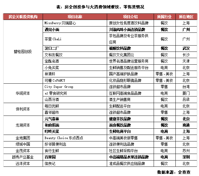 目前已有不少與房企存在關聯(lián)的投資機構加入到了大消費、新消費的投資隊伍中,其中投資規(guī)模較大的包括碧桂園創(chuàng)投、華潤資本、保利資本及龍湖資本等等。據(jù)不完全統(tǒng)計,從與餐飲及零售相關的消費品牌來看,房企關聯(lián)投資機構主要偏好新式酒飲及茶飲,被投資的品牌多達六家,如元氣森林、貝瑞甜心、寶醞名酒等;生鮮配送等熱門概念也成為投資重點,如小兔買菜、叮咚買菜、每日優(yōu)鮮、食行生鮮等;此外,投資范圍還包括有面食餐飲、社區(qū)超市、美妝等等。