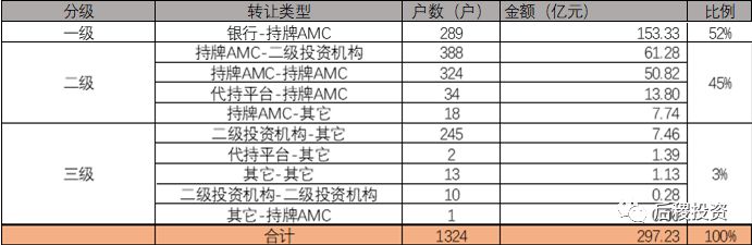 我們按行業慣性,把銀行出包定為一級市場;AMC收包、出包定為二級市場;其它為三級市場,同時為方便統計把其它-持牌AMC這種小批量的行為定為三級市場。