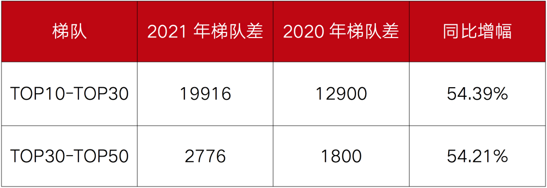 表:2021-2020年各梯隊(duì)企業(yè)在管門檻值梯隊(duì)差對比(萬平方米)