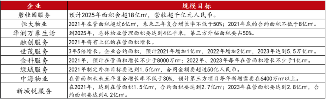 頭部企業(yè)更是定下高達(dá)數(shù)億的增長目標(biāo),恒大物業(yè)2021年在管面積將破6億㎡,合約面積不低于8億㎡;綠城服務(wù)合約面積將新增1.5億㎡,碧桂園服務(wù)則表示2025年規(guī)模超18億㎡,營收要超過千億元。世茂服務(wù)亦提出3年5倍計(jì)劃,2021年增加合約面積1億㎡,預(yù)計(jì)2023年合約面積達(dá)5.5億㎡。