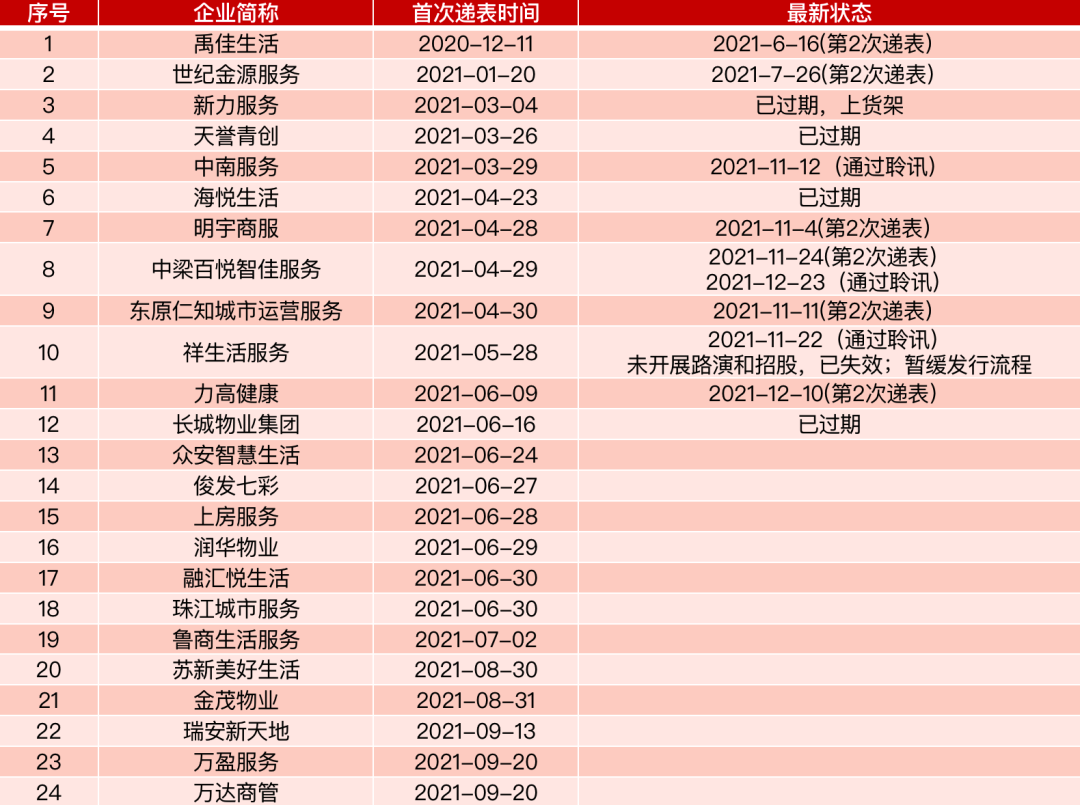 在市場的冰凍期,監(jiān)管層考慮、投資人離場心態(tài)、母公司急需資金紓困以及企業(yè)自身意愿的多重因素影響下,2021年下半年待上市物企被擺上貨架出售、推遲上市或者已經(jīng)通過聆訊也暫停上市。
