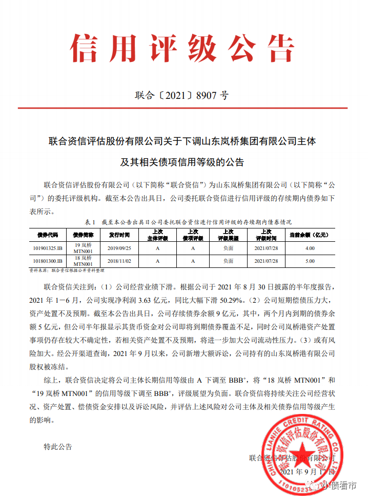 9月17日,聯(lián)合資信公告稱,決定將山東嵐橋集團(tuán)有限公司(以下簡稱“嵐橋集團(tuán)”)主體和“18嵐橋MTN001”、“19嵐橋MTN001”信用等級由A下調(diào)至BBB+,評級展望為負(fù)面。