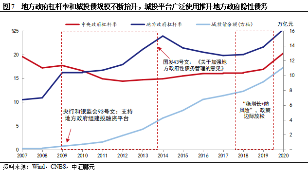 債務的本質是對未來信用的透支,如果未來產生的現金流不足以支付債務本息就會發生違約;如果未來產生的現金流不足以支付債務利息,那么問題就更為嚴重,因為債務規模就會“發散”,即債務雪球越滾越大,直至債務和資產價值崩潰,出現“明斯基時刻”,而土地財政對應的就是地方政府未來產生的現金流。我國地方政府債務的快速擴張始于2009年,國際金融危機后,我國迅速出臺大規模刺激政策,包括2009年3月,人民銀行、銀監會出臺了一系列關于融資平臺政策,放寬銀行信貸,支持有條件的地方政府組建投融資平臺發行企業債、中期票據等融資工具,拓寬中央政府投資項目的配套資金融資渠道。地方政府顯性債務和城投債務規模從2009年開始增加。2014年以來隨著“43號文”的出臺,監管層開始加強地方政府性債務管理,厘清地方政府與城投平臺關系,債務擴張放緩。但在宏觀經濟壓力下,2015年年下半年開始到2016年城投債監管政策轉向寬松,城投融資放量,隨后因債務增長過快,政策防風險目標突出。直至2018年中美貿易戰以及2020年疫情的影響下,政策轉向邊際放松。經測算,截至2020末,城投平臺有息債務39.73萬億元(其中城投債券余額11.07萬億),遠高于地方政府債務存量的25.66萬億元,且增速持續維持在10%以上,債務壓力無明顯減弱的趨勢。