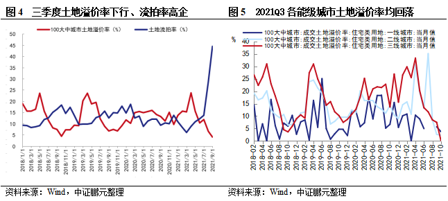 從房企拿地的結構上來看,從2017年開始受三四線城市棚改紅利減退以及政策調控影響,房企整體拿地銷售比呈下行趨勢,主流房企拿地銷售比從2017年的67.21%降至2020年的29.53%,2021年5月以來土地溢價率大幅下滑,其中三線城市溢價率回落幅度及趨勢最為明顯,同時整體土地流拍率已接近50%。因此,出于戰略考量,房企在結構上將更偏好有人口、產業支撐,并且去化理想的高能級城市。