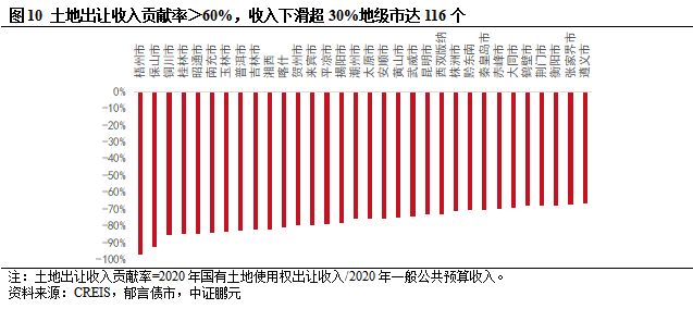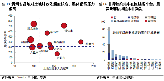 以第一類區域中貴州省為例,貴州下轄地級市2020年土地出讓收入貢獻率均高于90%,其中畢節、銅仁、黔南州和黔西南州的財政自給率低于30%,且各地級市間土地財政依賴度表現分化顯著。截至2021年9月末,貴州非標融資逾期城投主體約52家,涉及非標逾期事件86起,主體和逾期事件均占全國同期50%以上,且風險事件集中于區縣級平臺。2021年以來,更是有多家城投級別遭遇集中下調,再融資難度加大。誠然上述區域對土地財政的高度依賴并非區域債務風險暴露的導火索,但過高的土地財政依賴度使得“債務—投資”驅動的發展路徑,在土地財政及融資環境趨緊的影響下,令區域債務化解和信用風險的緩釋更趨復雜。