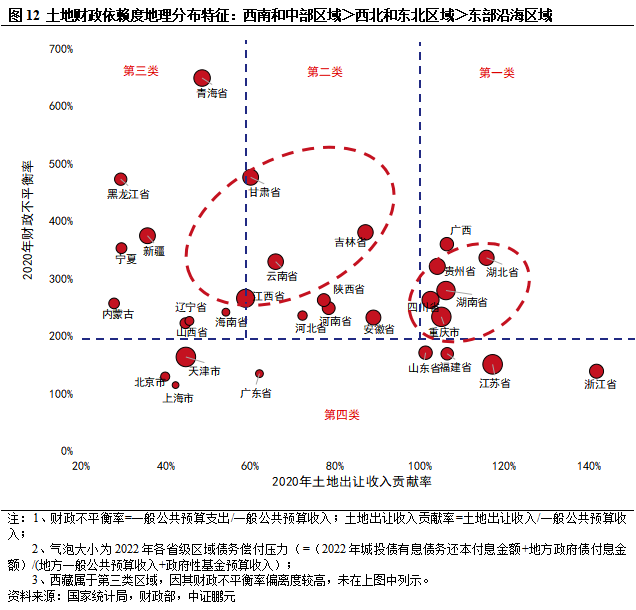 單一維度的土地財政依賴度對現實指導意義不大。我們以財政不平衡率和土地出讓收入貢獻率兩個維度衡量地方政府土地財政依賴度,省級區域視角下表現出極強的地理分布特征:西南和中部區域>西北和東北區域>東部沿海區域,若進一步考慮未來一年各區域的債務償付壓力,湖北省、湖南省、貴州省、四川省、重慶市、吉林省、云南省、甘肅省和江西省值得重點關注。