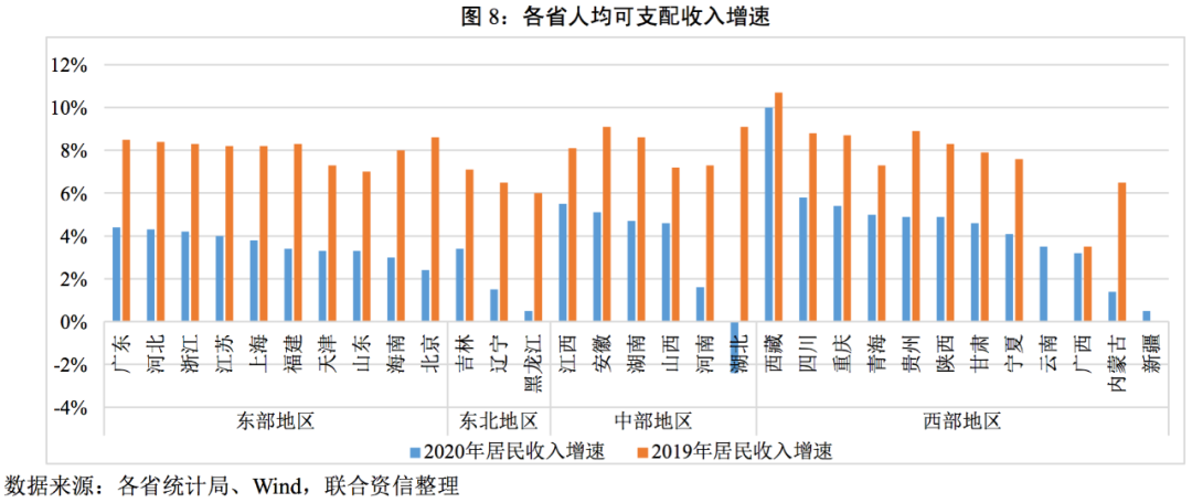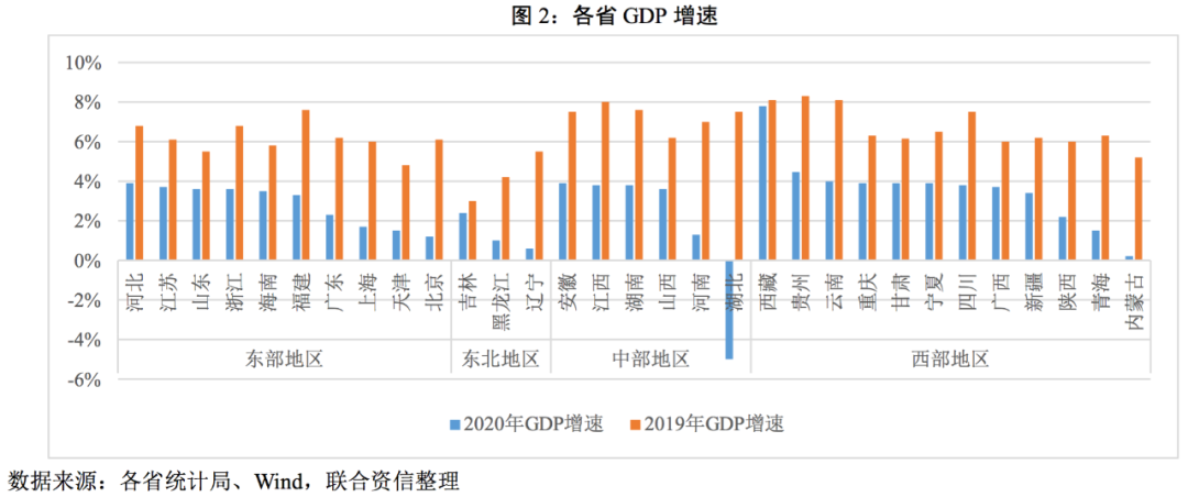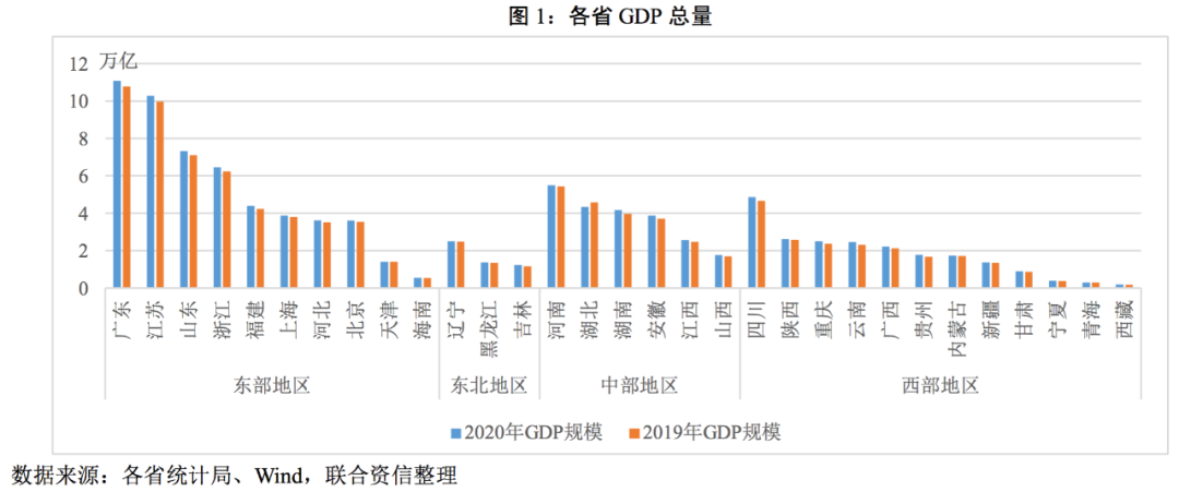?GDP總量在經(jīng)濟相對發(fā)達地區(qū)和欠發(fā)達地區(qū)的分化較為明顯,東部地區(qū)繼續(xù)維持領(lǐng)跑態(tài)勢;2020年,除湖北以外,其余30個省份GDP增速全部轉(zhuǎn)正,中西部地區(qū)增速分化更為明顯,東北地區(qū)經(jīng)濟恢復(fù)相對較慢,東部地區(qū)則相對較為均衡。